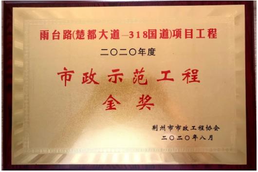 近日,由武漢建工路橋分公司承建的雨臺(tái)路(楚都大道-318國道)項(xiàng)目、福陽路(雞公山路-濱河路)項(xiàng)目,分別獲評(píng)“2020年度荊州市市政示范工程金獎(jiǎng)”。